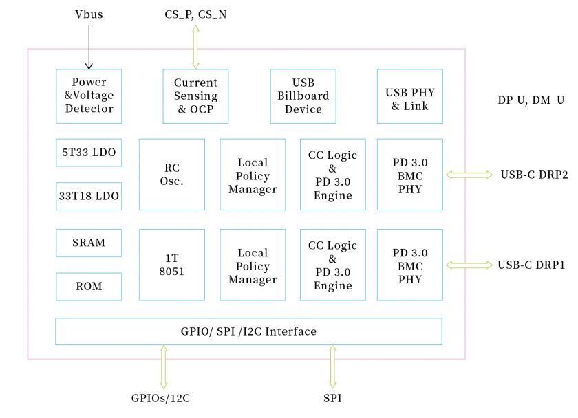 VIA Lab’s VP305 is a highly integrated single chip dual-port Power Delivery 3.0 controller aimed for multi-port USB-C power bricks with dynamic power management capability. Two integrated USB-C DRP ports can charge connected PD host and dead battery mode is supported. VP305’s Device Policy Manager could negotiate power rules with their port partners and perform smart power management based on port status. USB Billboard device function is implemented for easy FW update. VP305 also support smart auto-standby that automatically entering deep power saving mode when connected interface is in idle state.