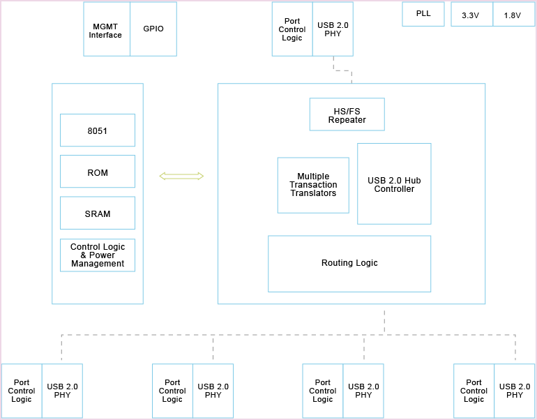 VIA Lab’s VL123 is a USB 2.0 Hub Controller, full compliance with USB 2.0 specification. VL123 is offered in one configuration: four USB 2.0 downstream ports and features integrated voltage regulators, new lower-power design. VL123 supports any combination of High Speed (480Mbps), Full Speed (12Mbps), and Low Speed (1.5Mbps) devices, and the integrated USB 2.0 hub’s Multiple Transaction Translators feature. The integrated regulator of 5V to 3.3V and 3.3V to 1.8V inside of VL123, therefore no external Voltage Regulator is required and can enable VL123 to be powered directly from USB VBus(5V), reducing BOM cost.